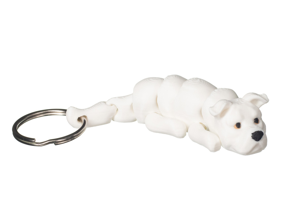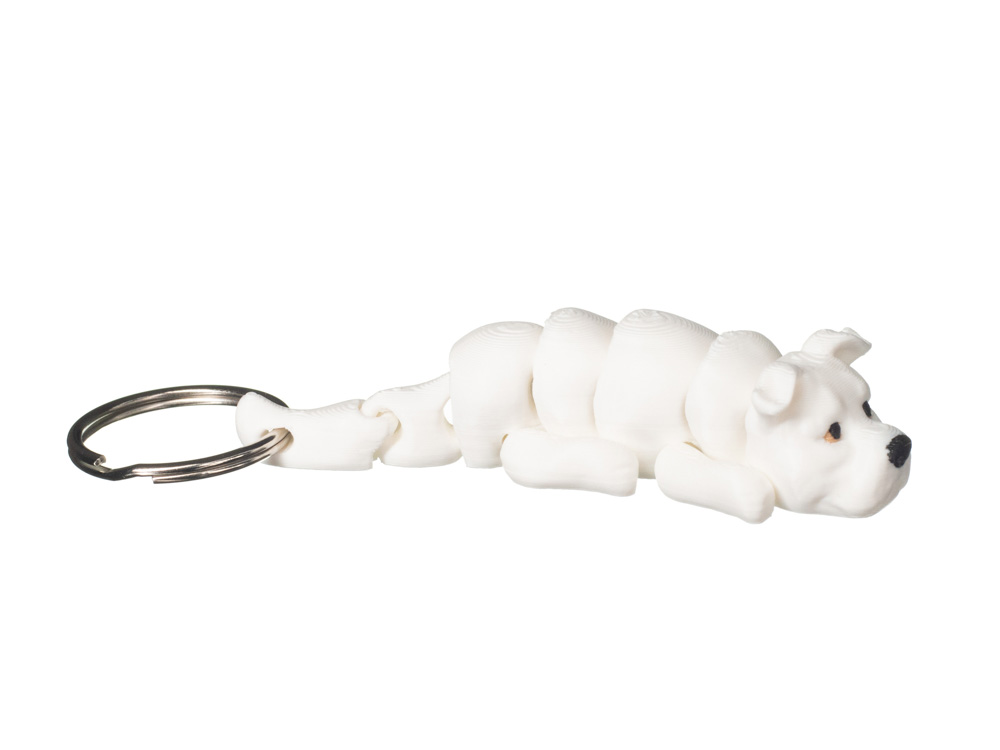 Brelok przedstawia psa rasy amstaff w minimalistycznej, nowoczesnej formie. Model utrzymany jest w jednolitej bieli, z subtelnymi detalami pyska i wyraźnie zaznaczoną sylwetką charakterystyczną dla tej rasy. Całość zachowuje spokojny, estetyczny wygląd i dobrze oddaje proporcje amstaffa.