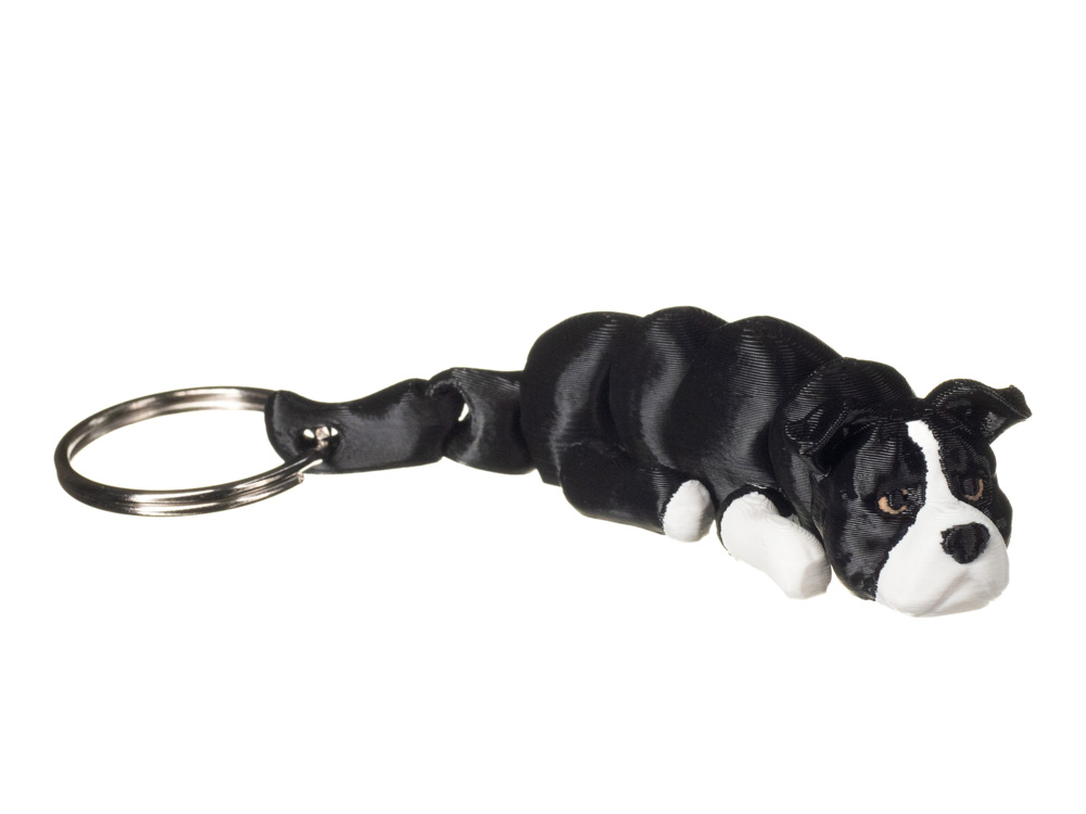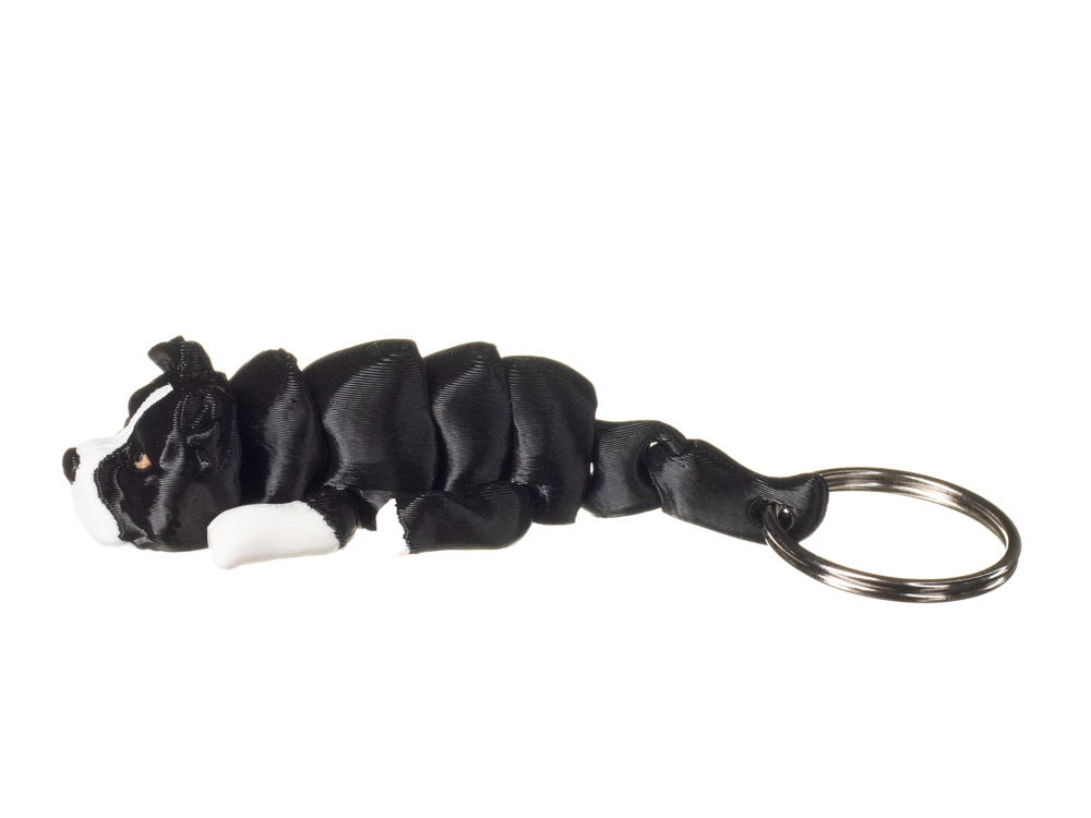 Ten brelok przedstawia amstaffa o czarno-białym umaszczeniu. Dominujący czarny kolor kontrastuje z białą kufą, piersią oraz łapami. Charakterystyczna, szeroka głowa i krótka kufa wiernie oddają cechy rasy, a delikatna faktura druku podkreśla detale sylwetki.