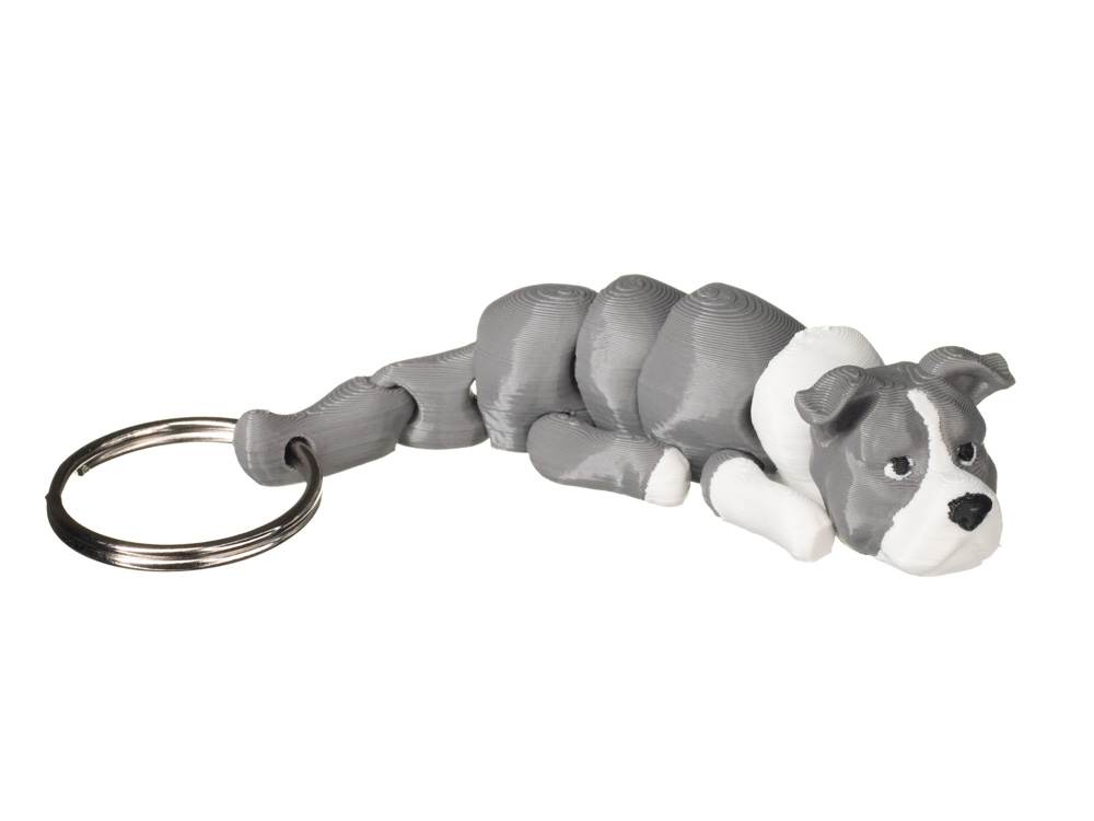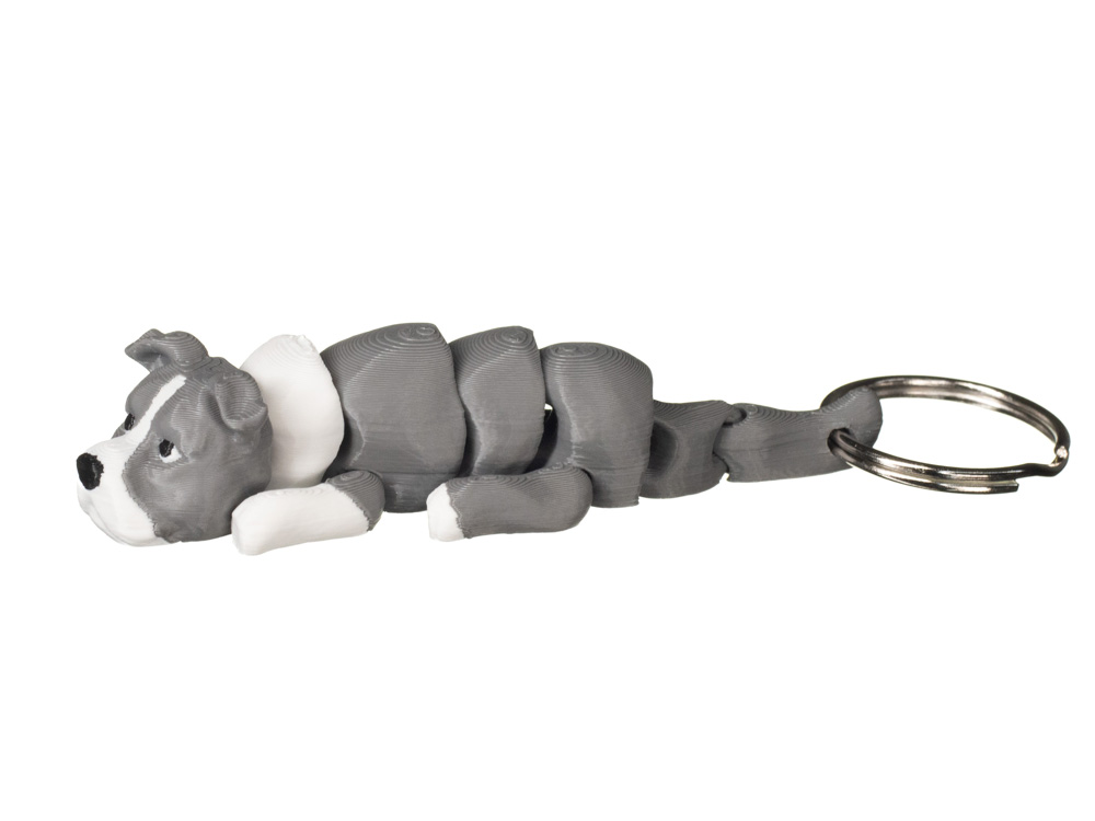 Ten brelok przedstawia amstaffa w spokojnej, dopracowanej formie. Model oddaje charakterystyczną budowę rasy oraz jej wyrazisty pysk. Szare umaszczenie zostało uzupełnione białym pyskiem, klatką piersiową i łapami, co nadaje całości realistycznego i estetycznego wyglądu. To kompaktowy dodatek, który dobrze sprawdzi się przy kluczach, torbie lub plecaku.