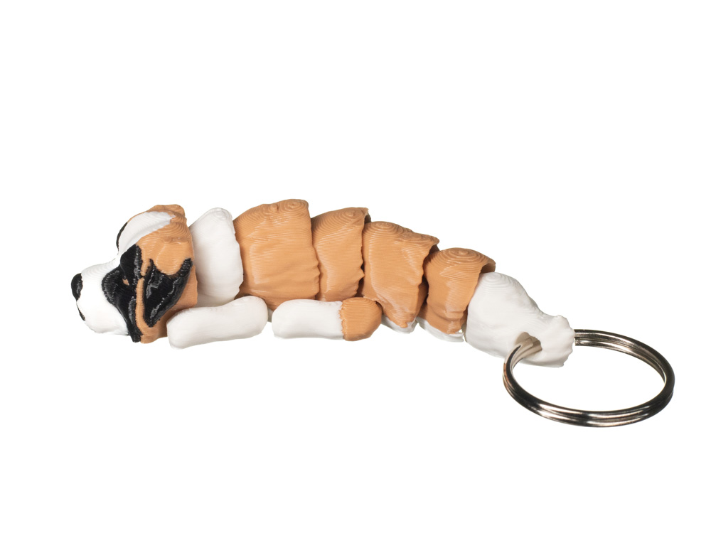 Brelok w kształcie bernardyna to wiernie odwzorowany model inspirowany charakterystycznym wyglądem tej rasy. Umaszczenie w odcieniach brązu i bieli, z wyraźną maską na pysku oraz jasnymi łapami, nadaje brelokowi rozpoznawalny i realistyczny wygląd. Projekt oddaje spokojny, przyjazny charakter bernardyna.