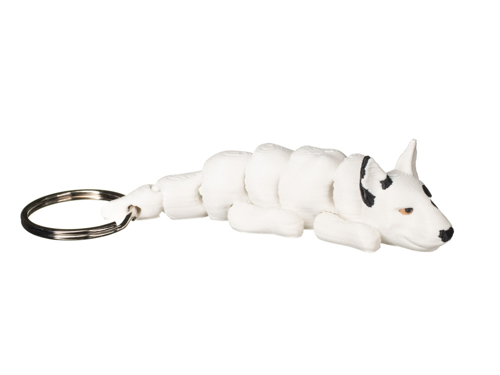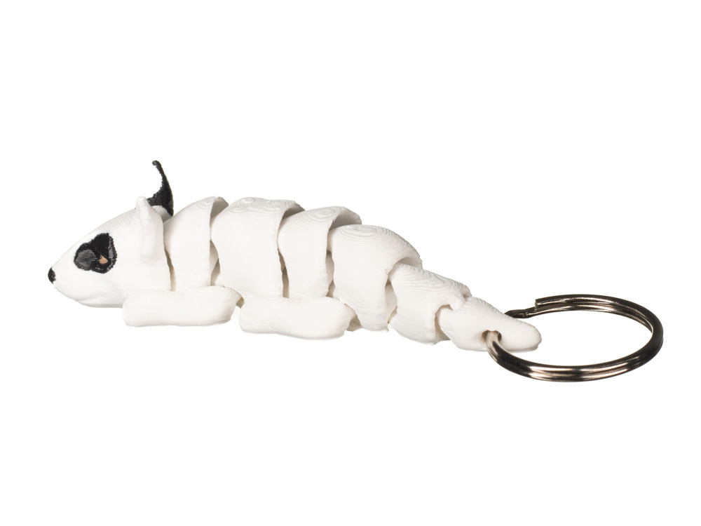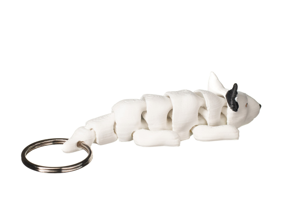 Brelok przedstawiający bulteriera to wyrazisty dodatek inspirowany charakterystyczną sylwetką tej rasy. Model oddaje typowy kształt głowy z długim pyskiem oraz stojące, spiczaste uszy. Dominujący biały kolor został uzupełniony czarną łatą wokół jednego oka oraz czarnymi akcentami na uszach i nosie, co nadaje całości realistycznego i rozpoznawalnego wyglądu. Subtelna faktura druku podkreśla detale i nadaje brelokowi nowoczesny charakter.