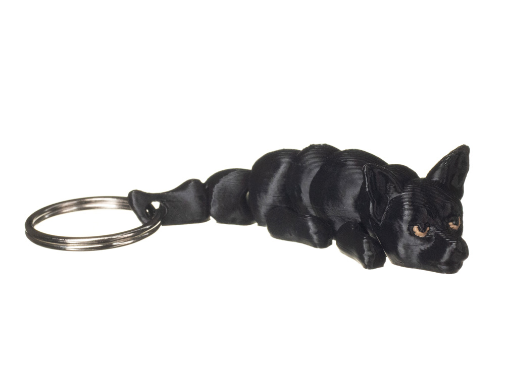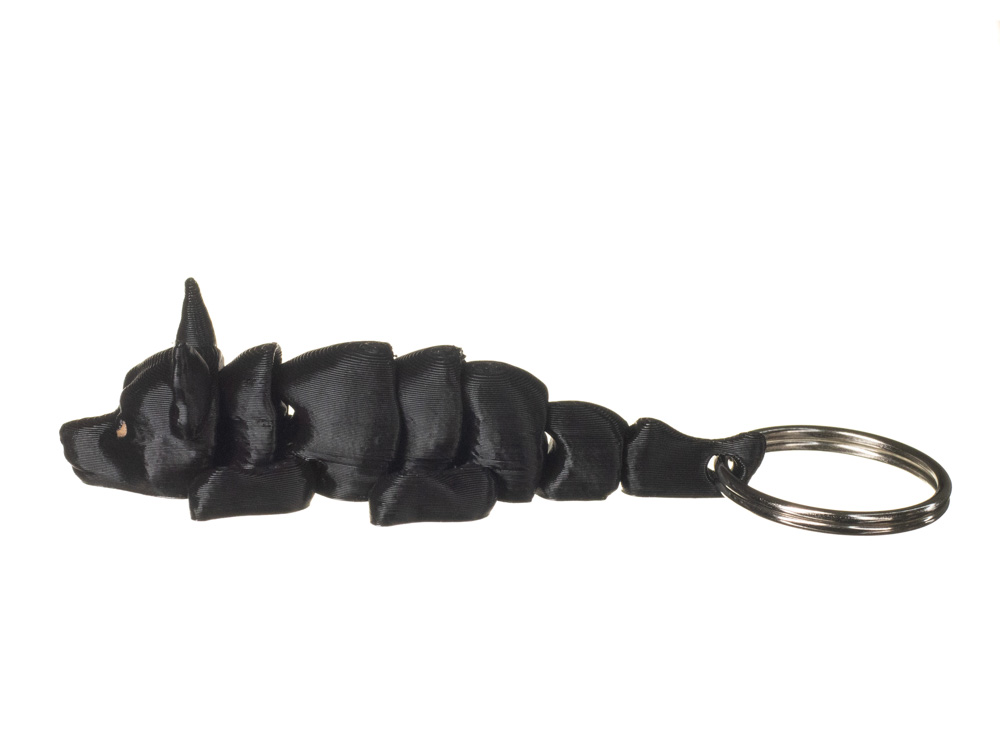 Prezentowany wariant wyróżnia się jednolitym, głębokim czarnym kolorem. Umaszczenie jest spójne na całej sylwetce, a pyszczek podkreślają jasne, kontrastowe oczy oraz subtelnie zaznaczony nosek, które nadają brelokowi charakteru i wyrazistości.