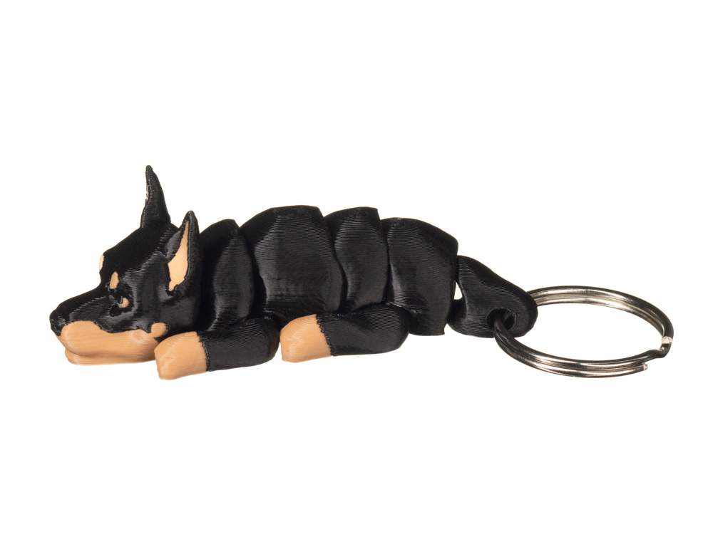 Brelok 3D w kształcie Dobermana to wyrazisty dodatek inspirowany charakterystycznym wyglądem tej rasy. Model wyróżnia się smukłą sylwetką, wyraźnie zaznaczoną głową oraz kontrastowym umaszczeniem. Dominująca czarna kolorystyka została uzupełniona jasnobrązowymi akcentami na pysku, łapach oraz wewnętrznej stronie uszu, co nadaje całości realistyczny i dynamiczny wygląd.