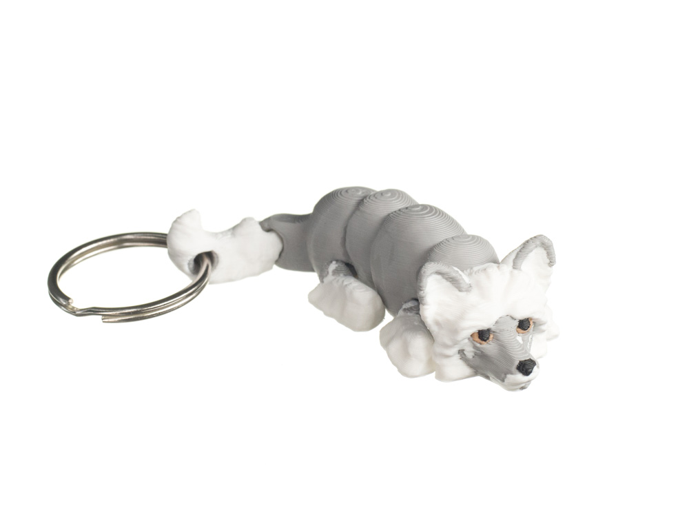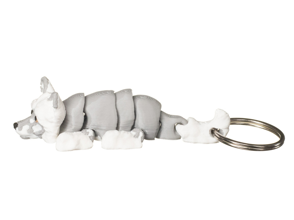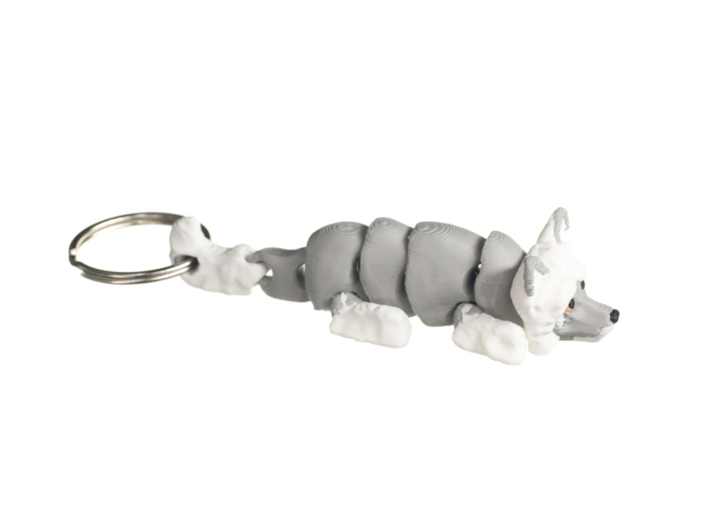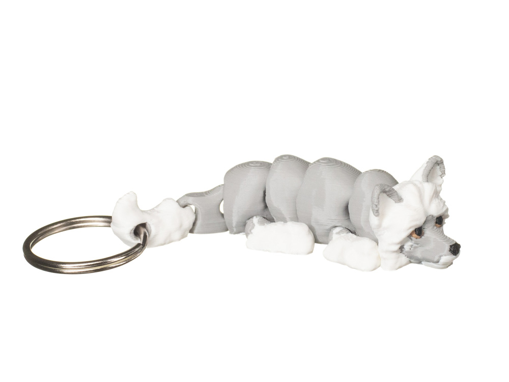 Prezentowany brelok posiada szare umaszczenie z białymi elementami. Jasne akcenty na pysku, łapach oraz końcówce ogona kontrastują z szarością tułowia i podkreślają unikalny wygląd rasy.