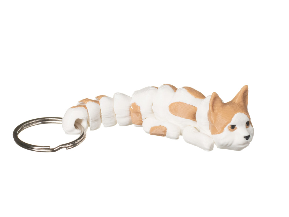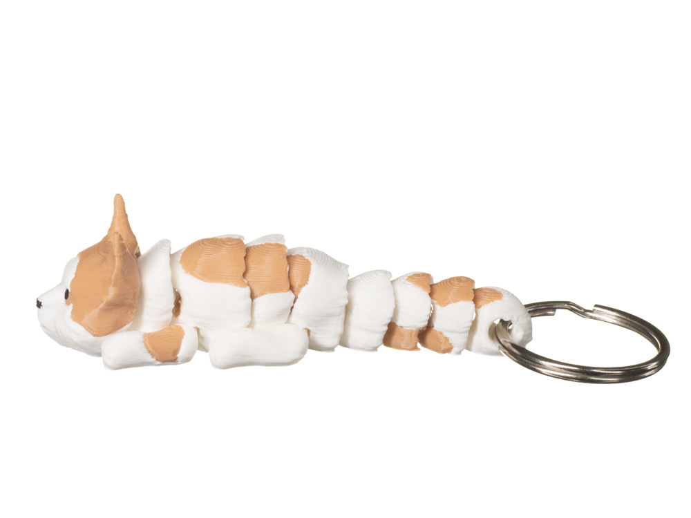 Prezentowany wariant wyróżnia się białym umaszczeniem z rudymi łatami rozmieszczonymi na głowie, tułowiu i ogonie. Kontrast jasnej bieli z ciepłym odcieniem rudego nadaje brelokowi wyrazistego, a jednocześnie przyjaznego charakteru.