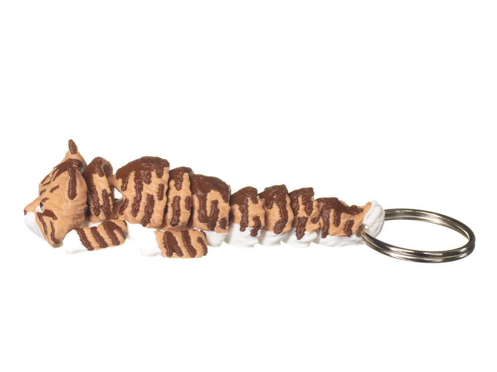 Prezentowany wariant wyróżnia się ciepłym, rudo-brązowym umaszczeniem z wyraźnymi, ciemniejszymi pręgami. Białe łapki oraz jasny pyszczek kontrastują z intensywną kolorystyką tułowia, nadając brelokowi dynamicznego i realistycznego charakteru.