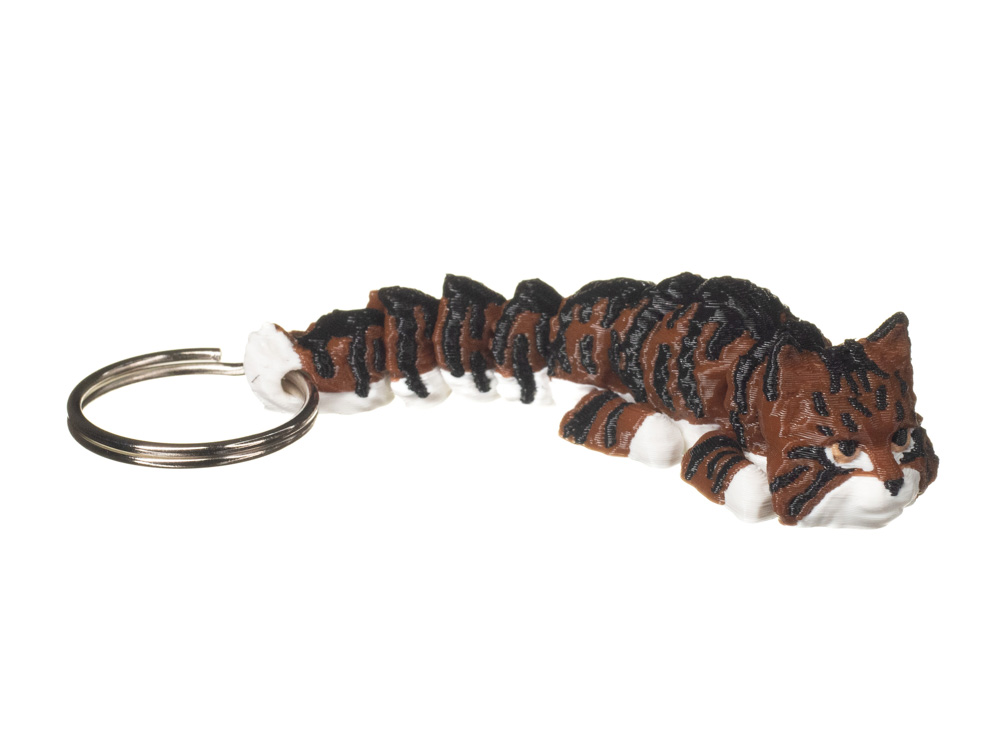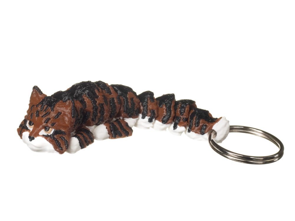 Prezentowany wariant wyróżnia się głębokim, ciemnobrązowym umaszczeniem z intensywnymi czarnymi pręgami. Białe łapki oraz jaśniejszy pyszczek tworzą wyraźny kontrast z ciemnym grzbietem i ogonem, nadając brelokowi dynamicznego i realistycznego charakteru.