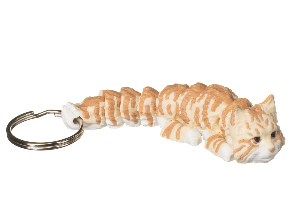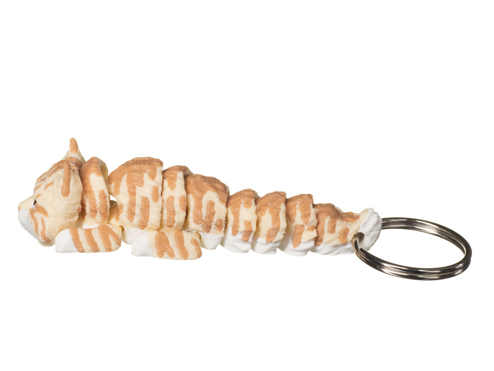 Prezentowany wariant wyróżnia się jasnym, kremowym umaszczeniem z ciepłymi rudymi pręgami. Białe łapki oraz jaśniejszy pyszczek harmonijnie łączą się z delikatnie paskowanym tułowiem, nadając brelokowi naturalnego i eleganckiego charakteru.