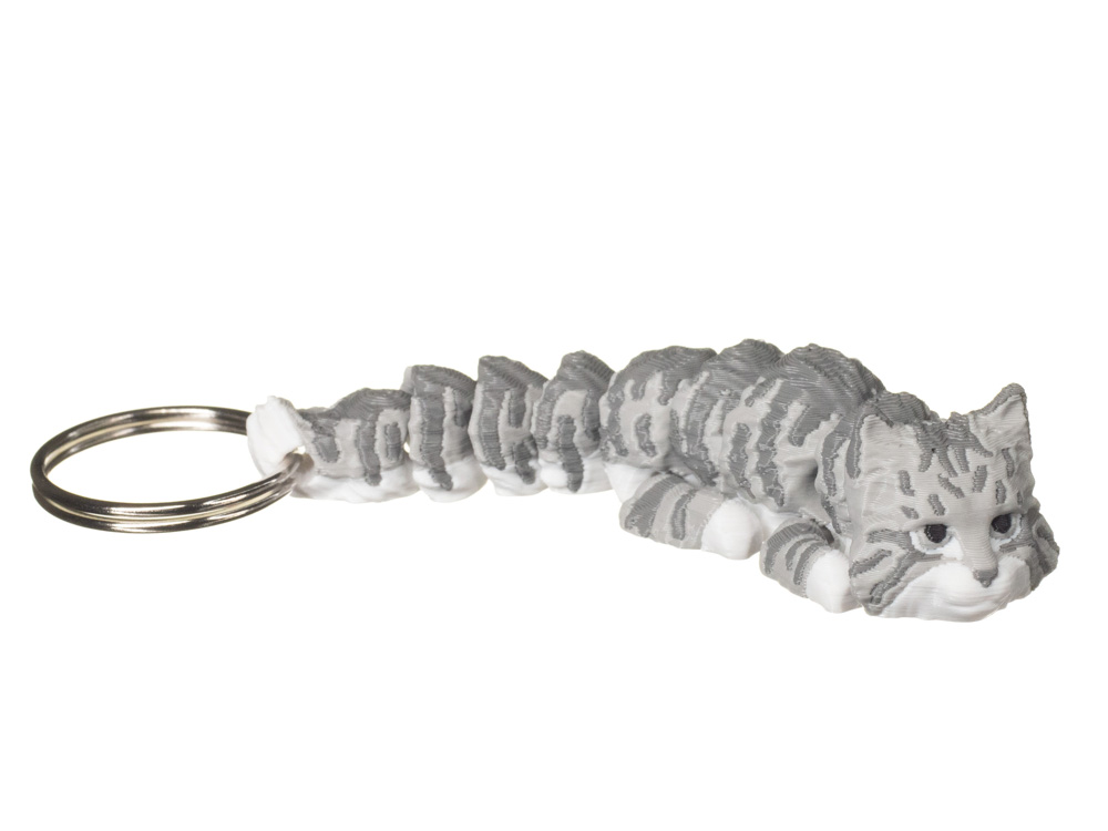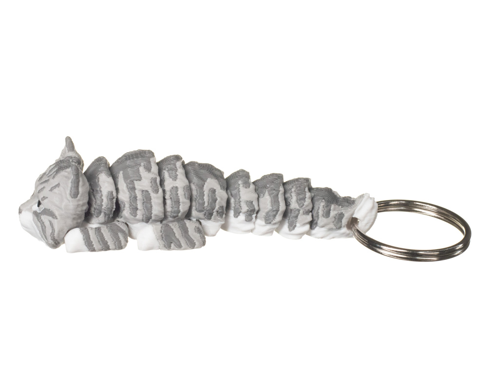 Prezentowany wariant wyróżnia się jasnoszarym umaszczeniem z delikatnymi, ciemniejszymi szarymi pręgami. Subtelne przejścia tonalne na grzbiecie i ogonie oraz jaśniejsze łapki nadają brelokowi naturalnego i eleganckiego wyglądu.