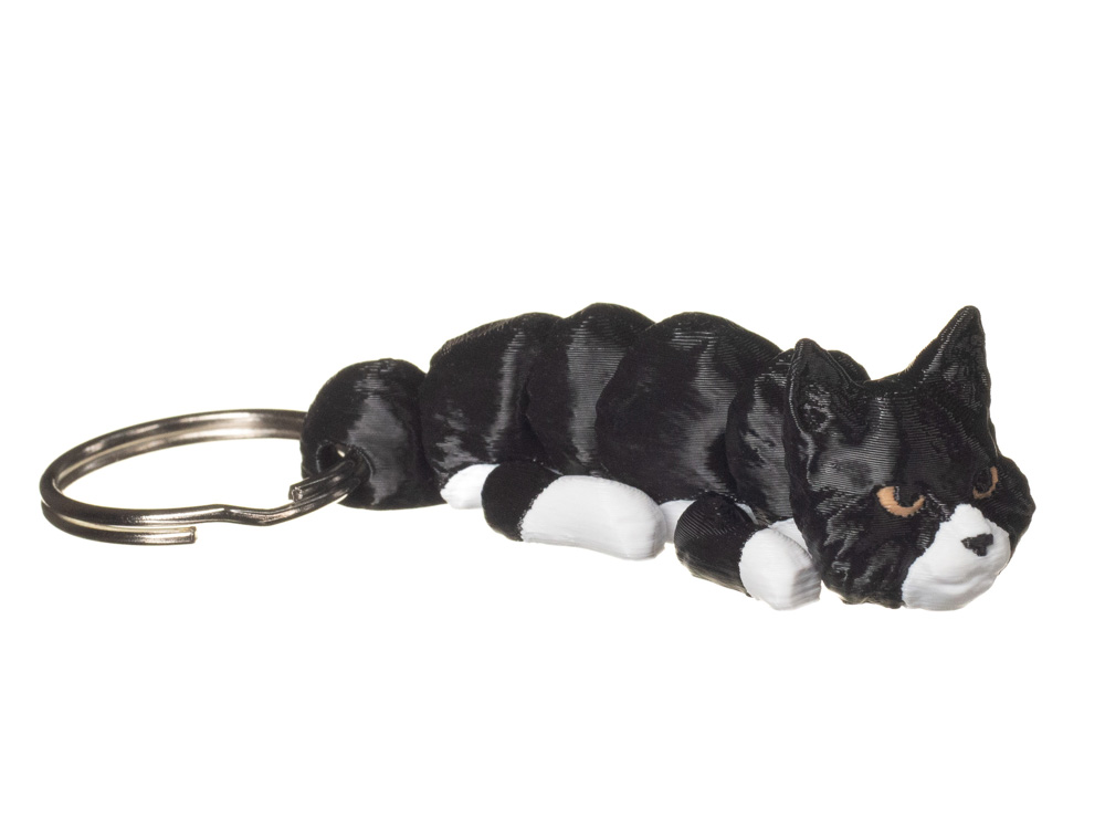 Prezentowany wariant wyróżnia się kontrastowym, czarno-białym umaszczeniem. Głęboka czerń tułowia została przełamana białymi łapkami oraz jasnym pyszczkiem, co nadaje brelokowi wyrazistego i dynamicznego charakteru.
