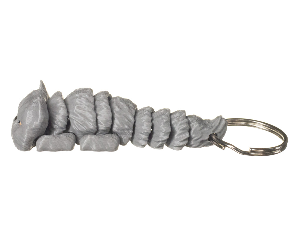 Prezentowany wariant posiada jednolite, szare umaszczenie w chłodnym odcieniu. Subtelna kolorystyka została uzupełniona jasnymi, bursztynowymi oczami oraz ciemnym noskiem, co podkreśla wyraz pyska i nadaje brelokowi eleganckiego charakteru.