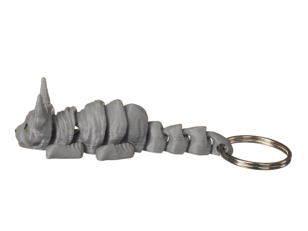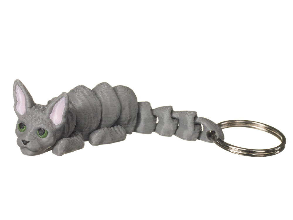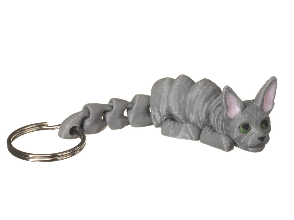 Prezentowany wariant posiada jednolite, szare umaszczenie z intensywnie zielonymi oczami oraz jasnoróżowymi wnętrzami uszu. Minimalistyczna kolorystyka w połączeniu z wyraźnym spojrzeniem nadaje brelokowi nowoczesnego i oryginalnego charakteru.
