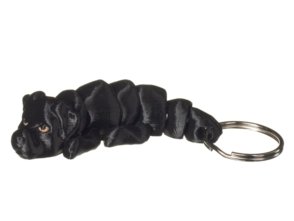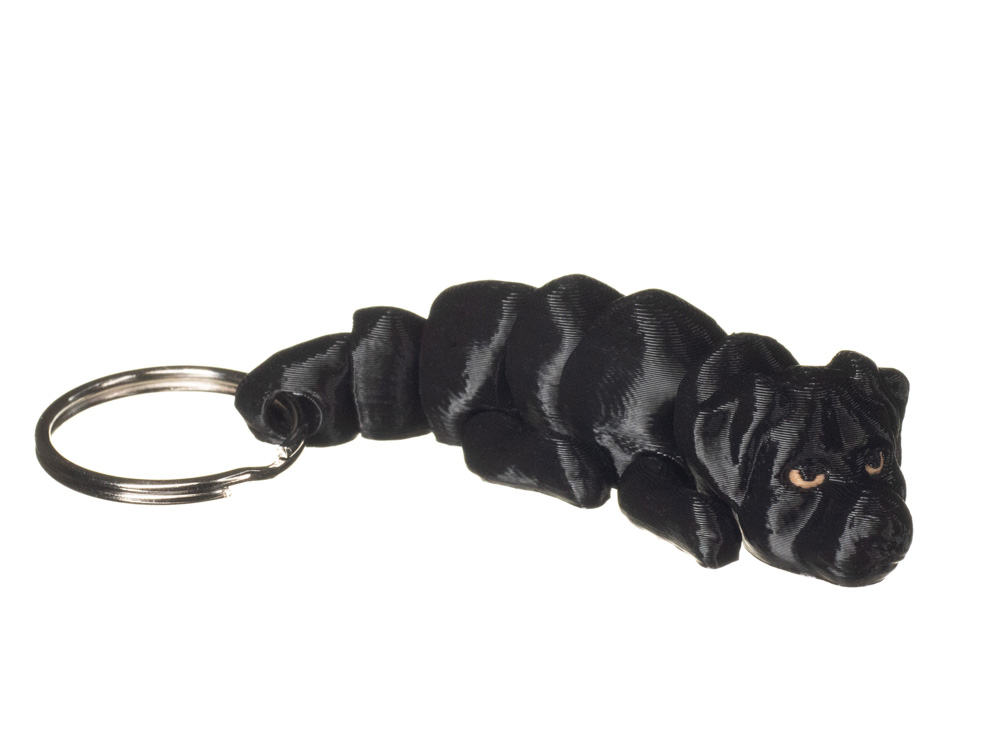Prezentowany brelok posiada jednolite, głębokie czarne umaszczenie. Cała sylwetka utrzymana jest w jednym kolorze, a pyszczek podkreślają subtelnie zaznaczone oczy i nosek, co nadaje brelokowi spokojny i elegancki wygląd.