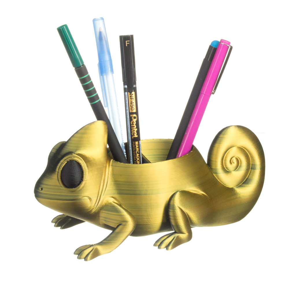 „Kameleon” to praktyczny i efektowny organizer na biurko, który łączy funkcjonalność z niecodziennym designem. Jego podwójna komora pozwala wygodnie rozdzielić akcesoria — z jednej strony długopisy, z drugiej cienkopisy, markery lub drobne biurowe dodatki. Zwarta forma i szeroki rozstaw łapek zapewniają stabilność, a zakręcony ogon dodaje całości charakteru.