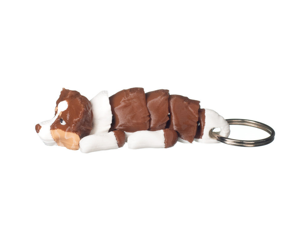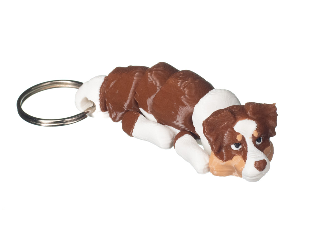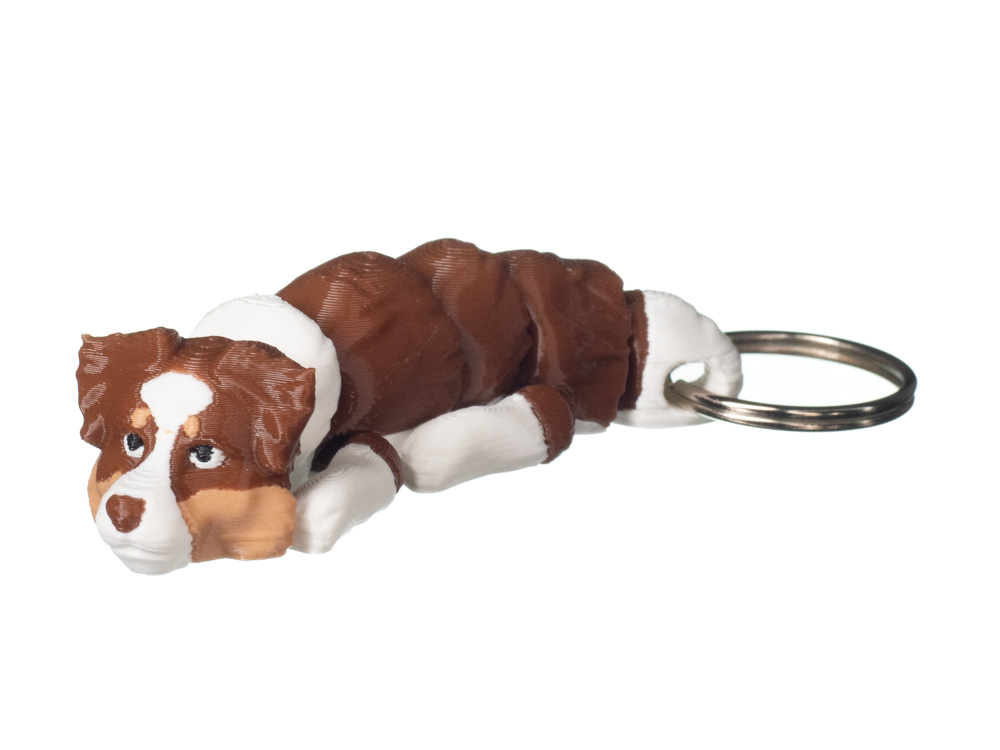 Brelok 3D w kształcie owczarka australijskiego to wyrazisty dodatek inspirowany dynamicznym i inteligentnym charakterem tej rasy. Model posiada brązowo-białe umaszczenie z jasnymi partiami pyska, łap i szyi, które nadają mu naturalny i dobrze rozpoznawalny wygląd. Wyraźne przejścia kolorystyczne oraz detale pyska sprawiają, że brelok prezentuje się realistycznie i przyciąga wzrok.