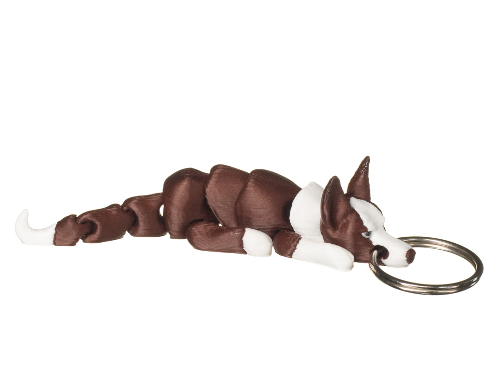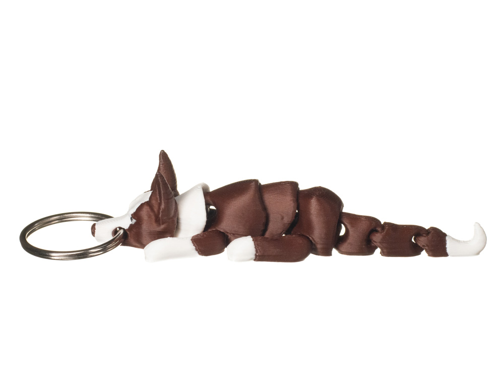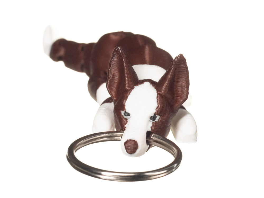 Prezentowany brelok charakteryzuje się kontrastowym umaszczeniem w odcieniach brązu i bieli. Ciemniejszy tułów zestawiono z jasnym pyskiem, łapami oraz końcówką ogona, co podkreśla sylwetkę i dynamiczny charakter tej rasy.