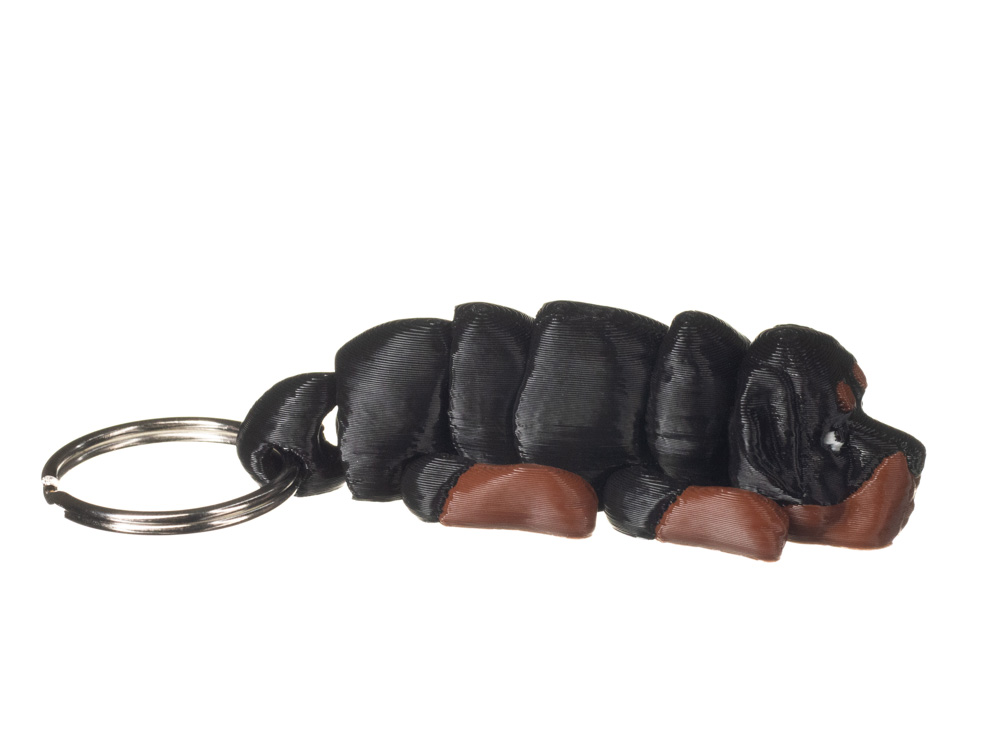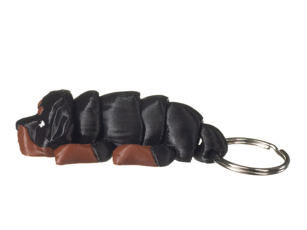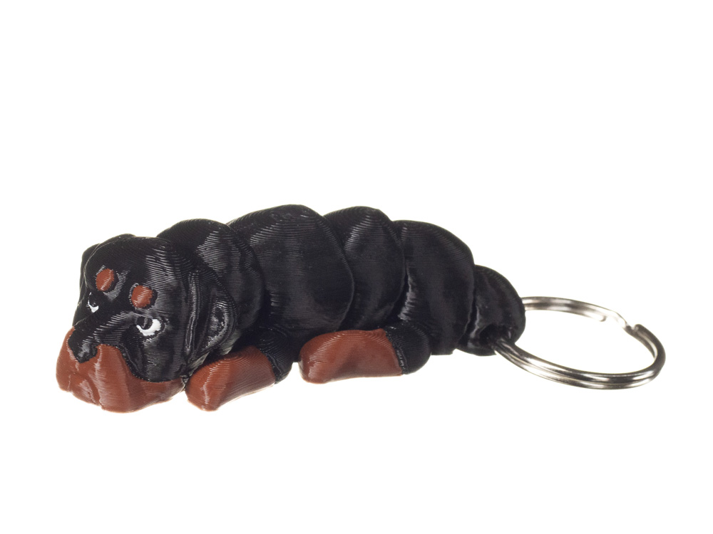 Brelok w kształcie rottweilera wiernie oddaje charakterystyczne cechy tej rasy. Dominująca czerń została uzupełniona ciepłymi, brązowymi podpaleniami na pysku i łapach, co nadaje figurce naturalny i rozpoznawalny wygląd. Wyraźnie zaznaczone detale pyska oraz proporcjonalna sylwetka sprawiają, że brelok wygląda solidnie i estetycznie.