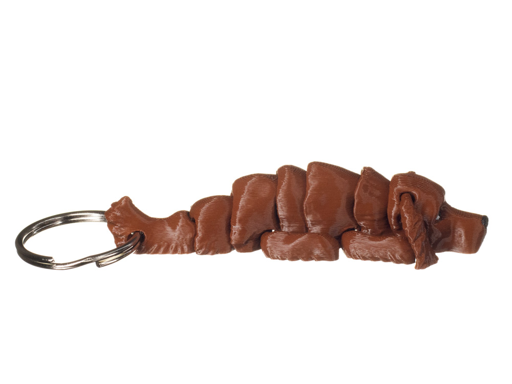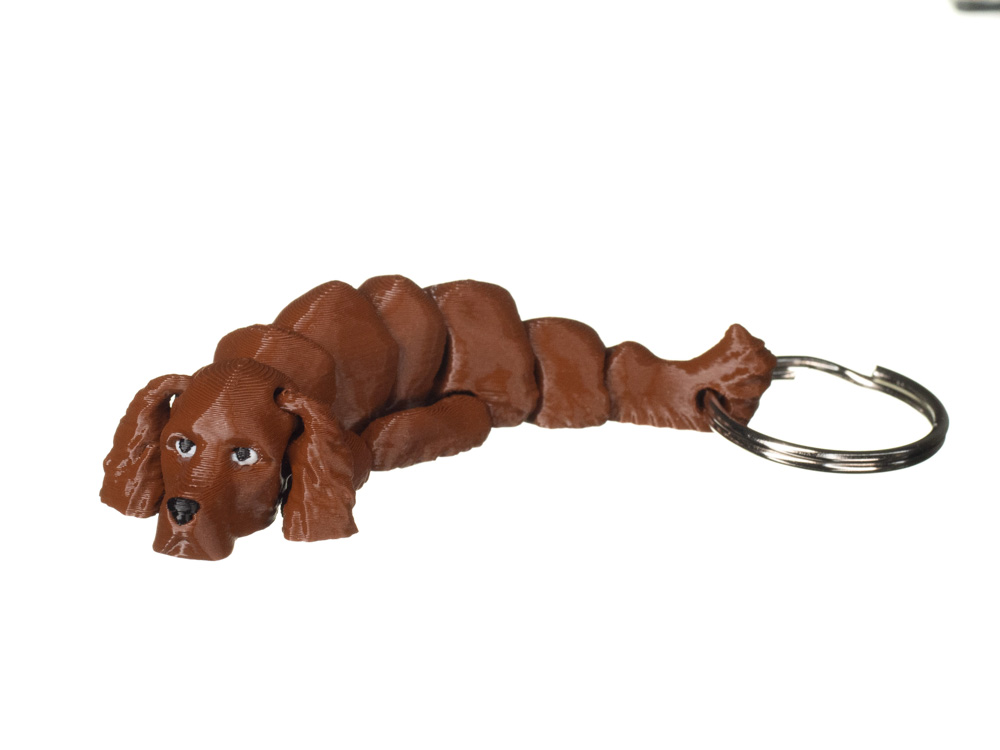 Brelok przedstawia psa rasy Seter irlandzki, odwzorowanego w charakterystycznej dla rasy formie. Model posiada jednolite, ciepłe umaszczenie w odcieniu brązowym, z delikatnie zaznaczonymi oczami i nosem. Całość utrzymana jest w spójnym, realistycznym stylu, z dbałością o detale sylwetki i głowy.